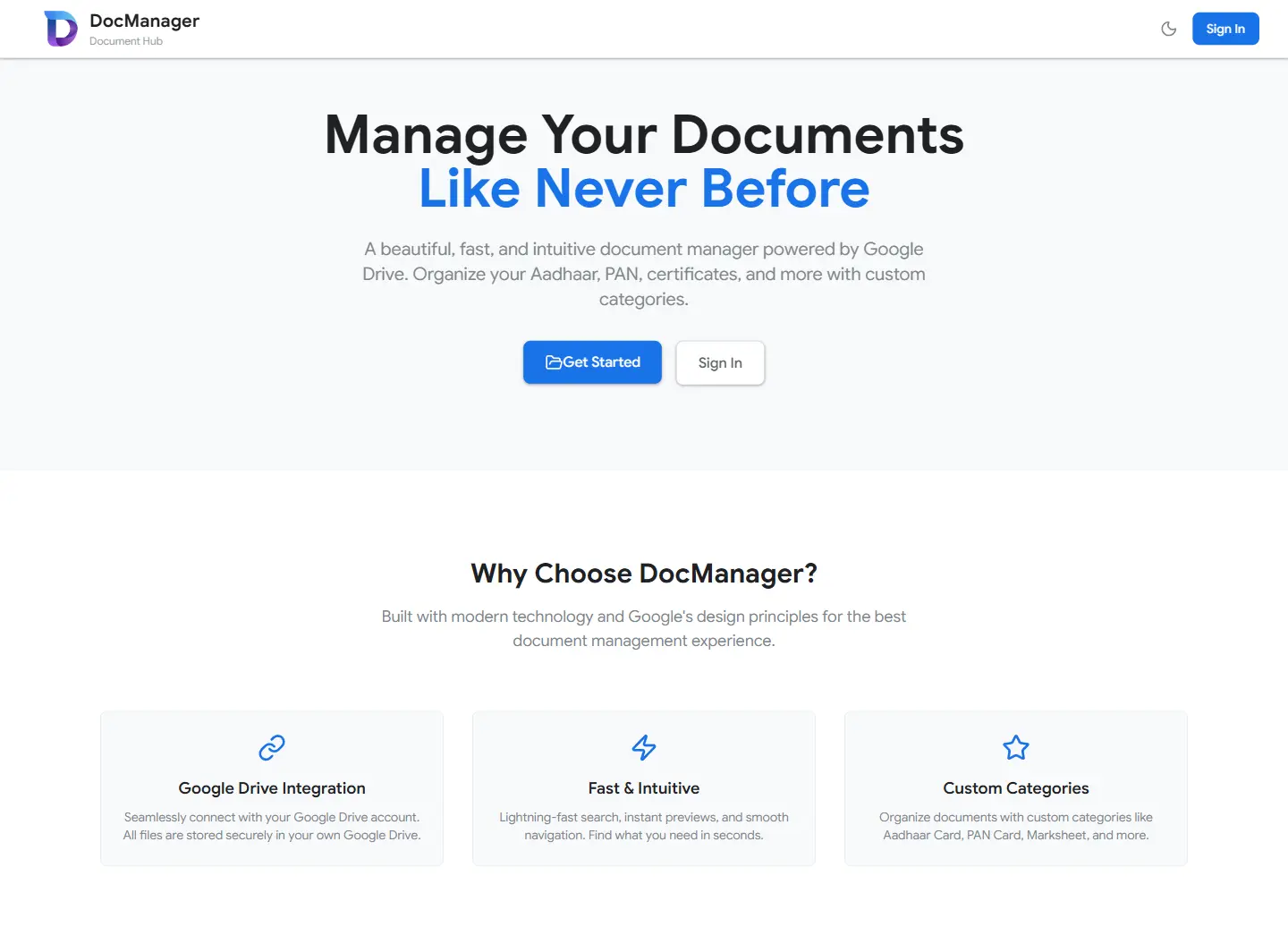 Personal document management app with custom categories, Google authentication, and secure Google Drive integration.